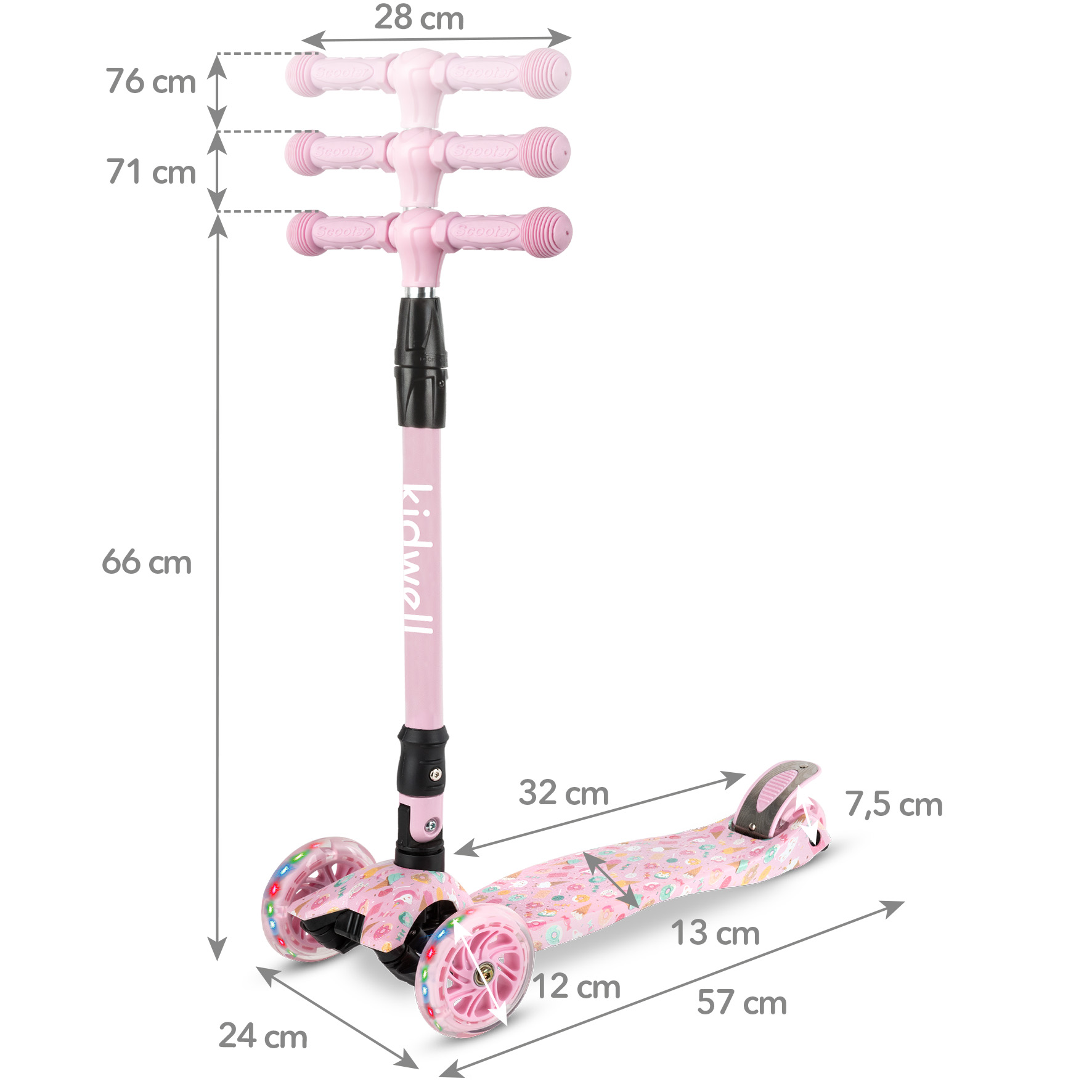 - Materiały: Aluminiowa kierownica, plastikowy podest, poliuretanowe koła z diodami LED