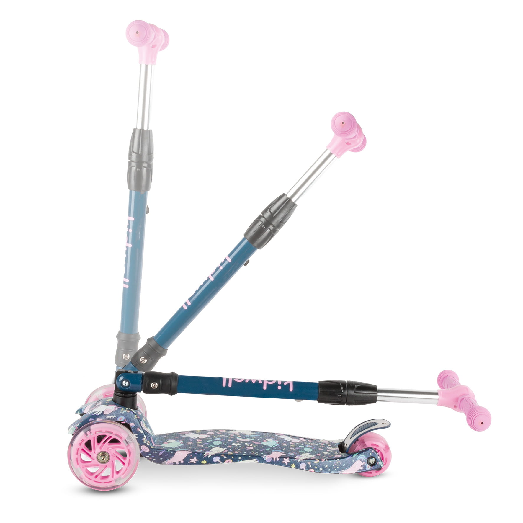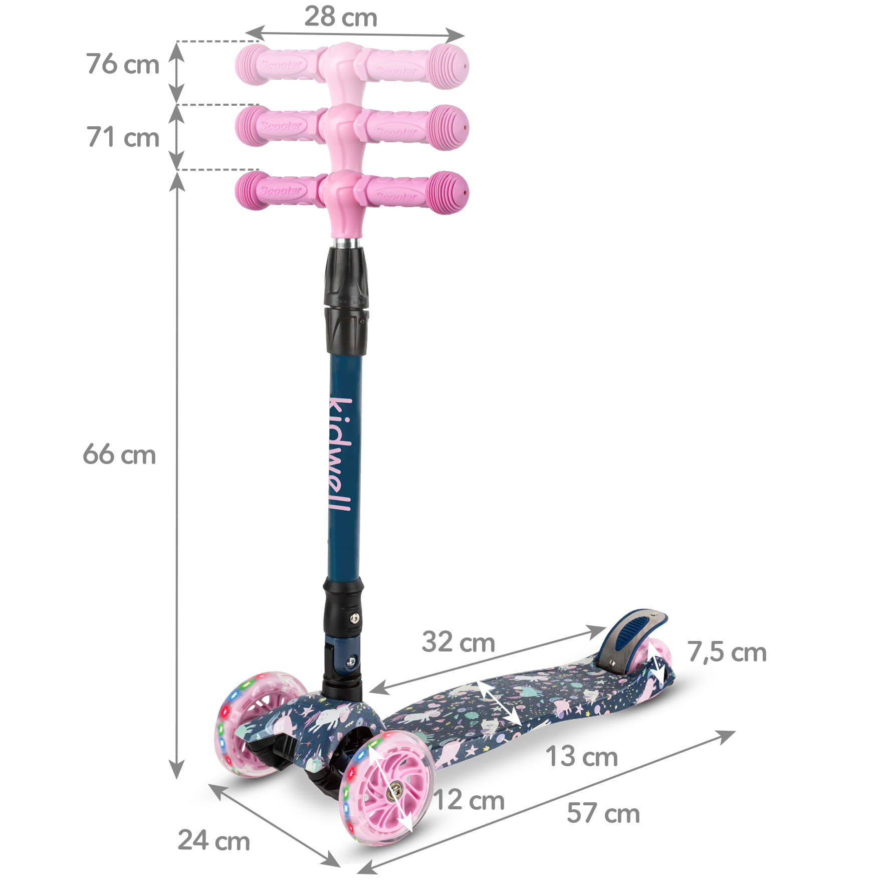 - Materiały: Aluminiowa kierownica, plastikowy podest, poliuretanowe koła z diodami LED