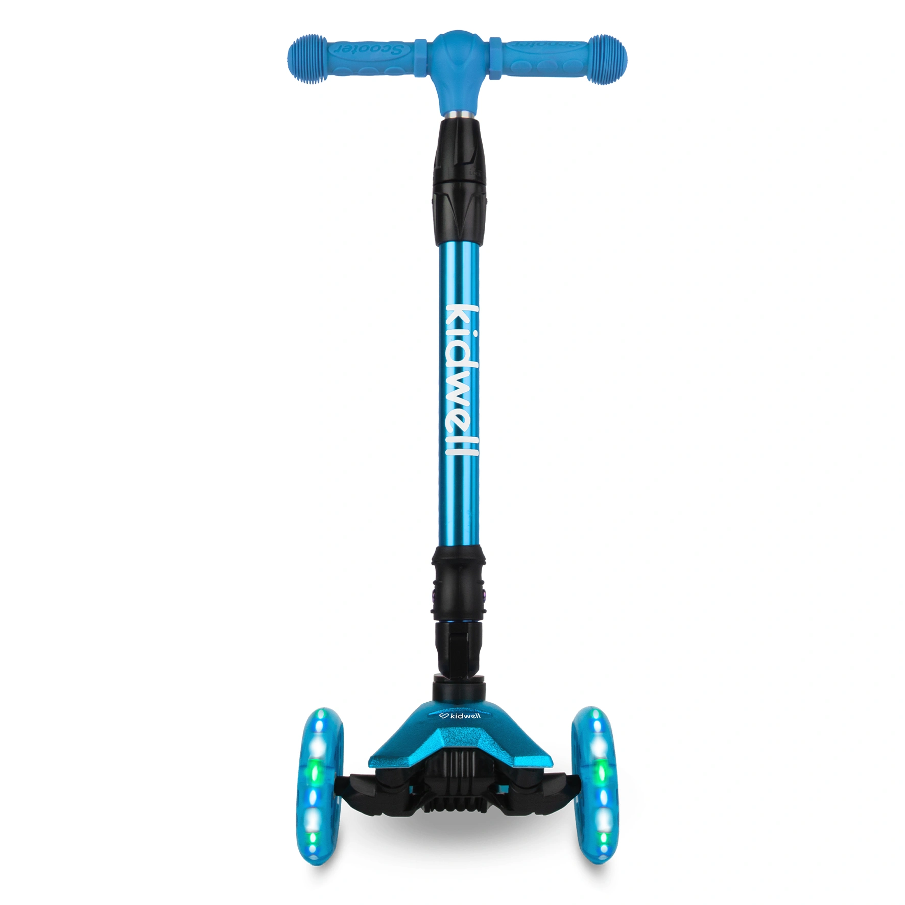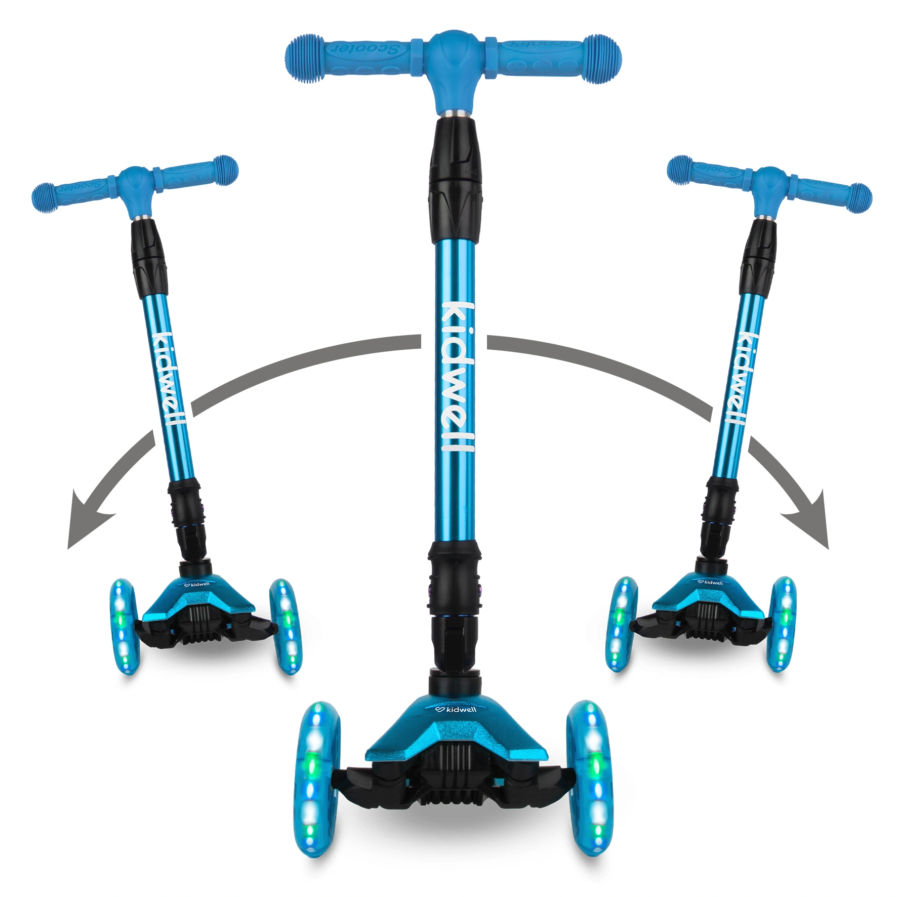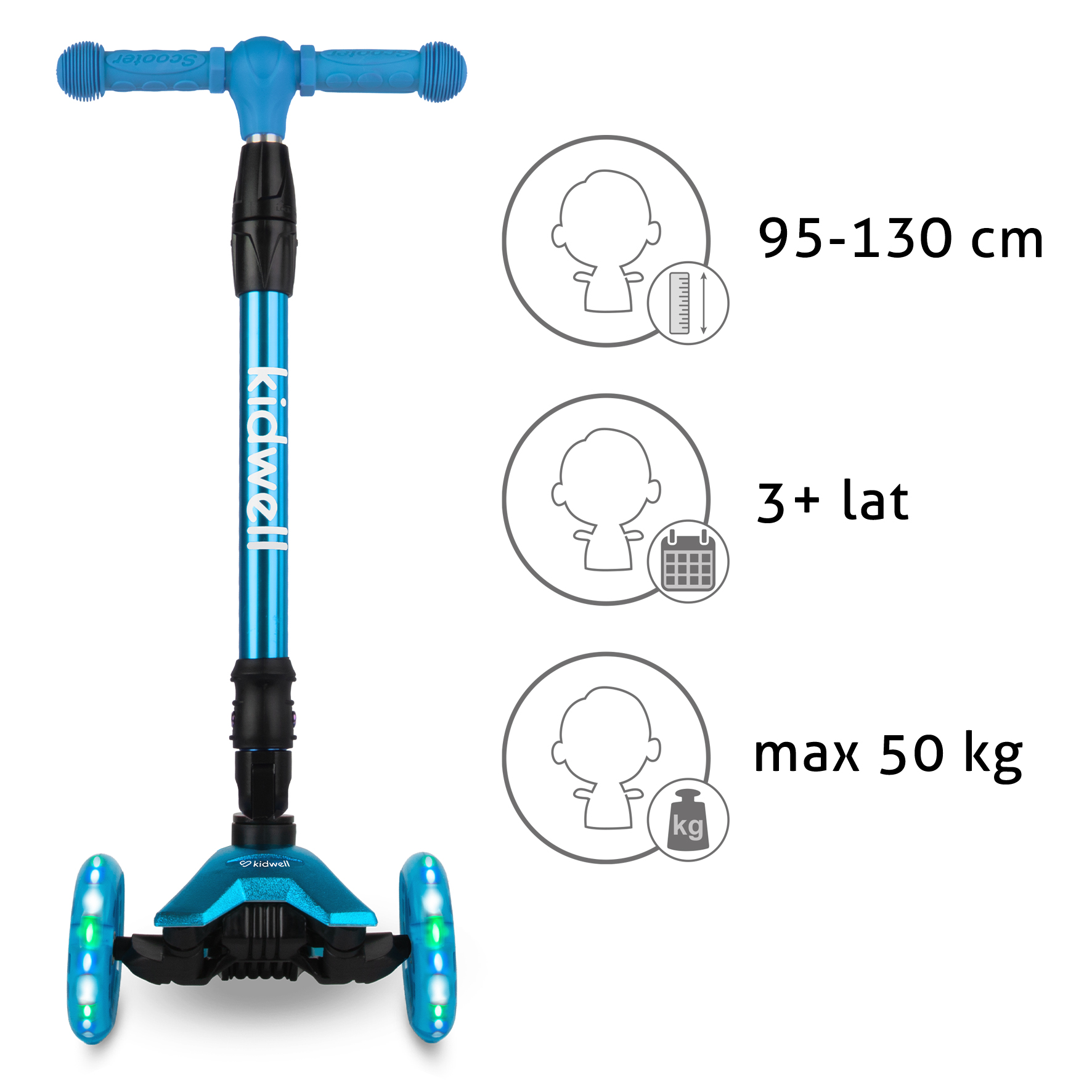 - Materiały: Aluminiowa kierownica, plastikowy podest, poliuretanowe koła z diodami LED