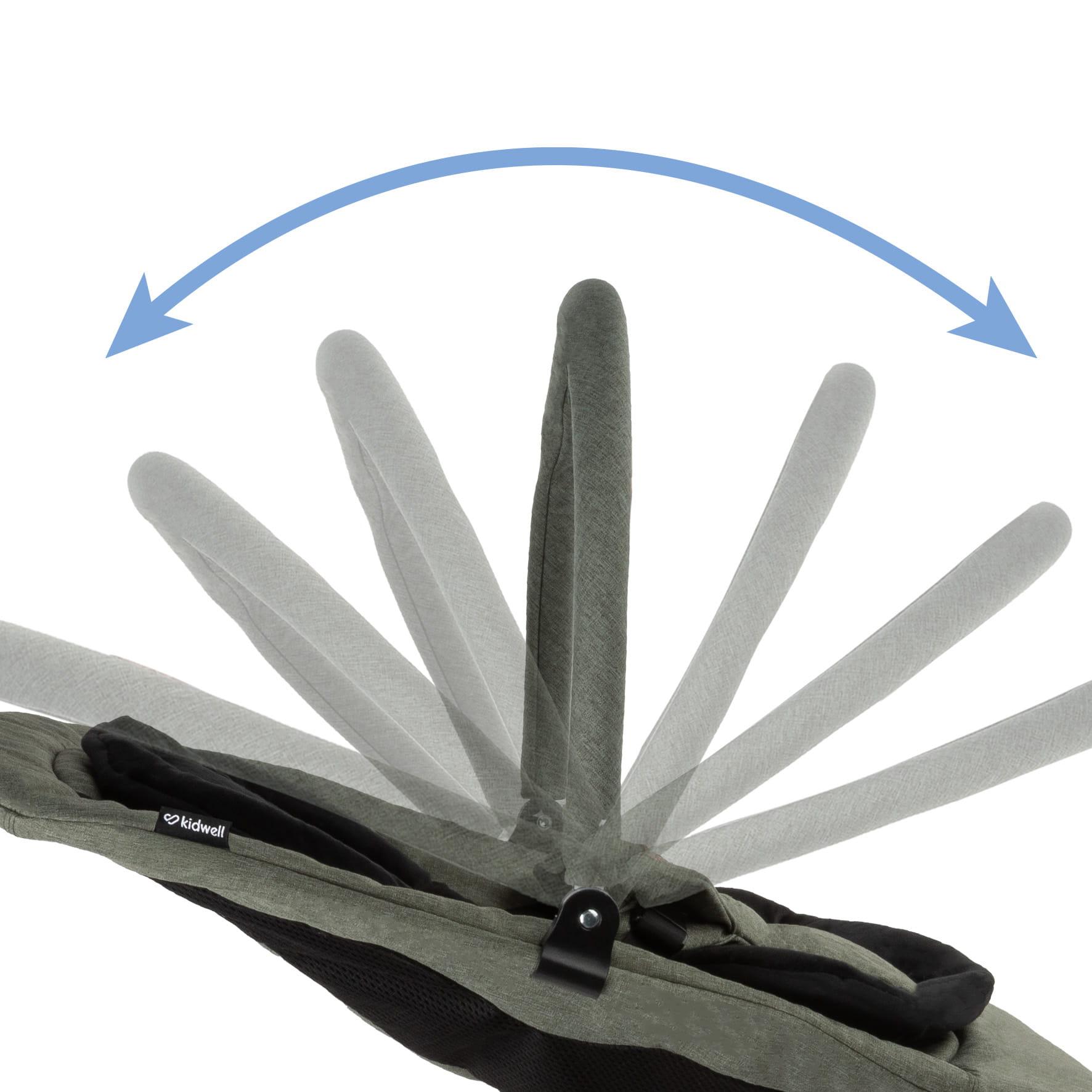 Kidwell Rubi wyposażono w regulowany pałąk z dwiema uroczymi miękkimi zabawkami. Możesz ustawić go tak, aby maluch swobodnie sięgał po zabawki, podziwiał je z bliska albo by były poza zasięgiem wzroku – w zależności od nastroju i potrzeb.