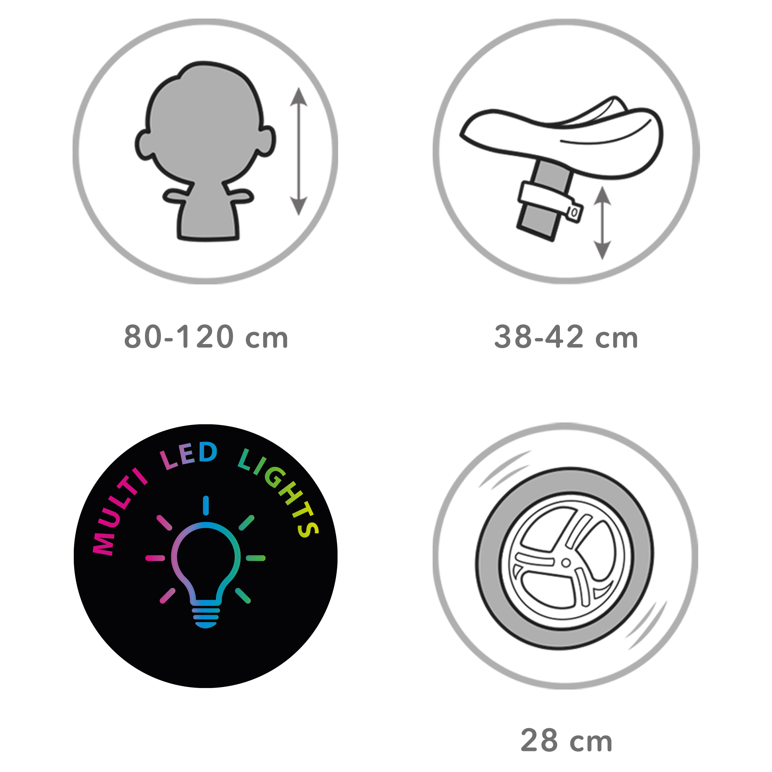 Największą jej zaletą są światła LED, dzięki którym dziecko będzie doskonale widoczne przy gorszej pogodzie oraz gdy na zewnątrz robi się szaro, a zabawa trwa w najlepsze. Zwiększy to bardzo bezpieczeństwo podczas użytkowania. Posiada aż 20 sekwencji świetlnych. Rama dodatkowo wykonana jest z bardzo trwałego nylonu, stosowanego w przemyśle do produkcji odpornych na obciążenia elementów. Dzięki wadze zaledwie 3,05 kg, maluch bez wysiłku uczy się utrzymywać równowagę i usprawnia koordynację ruchową.